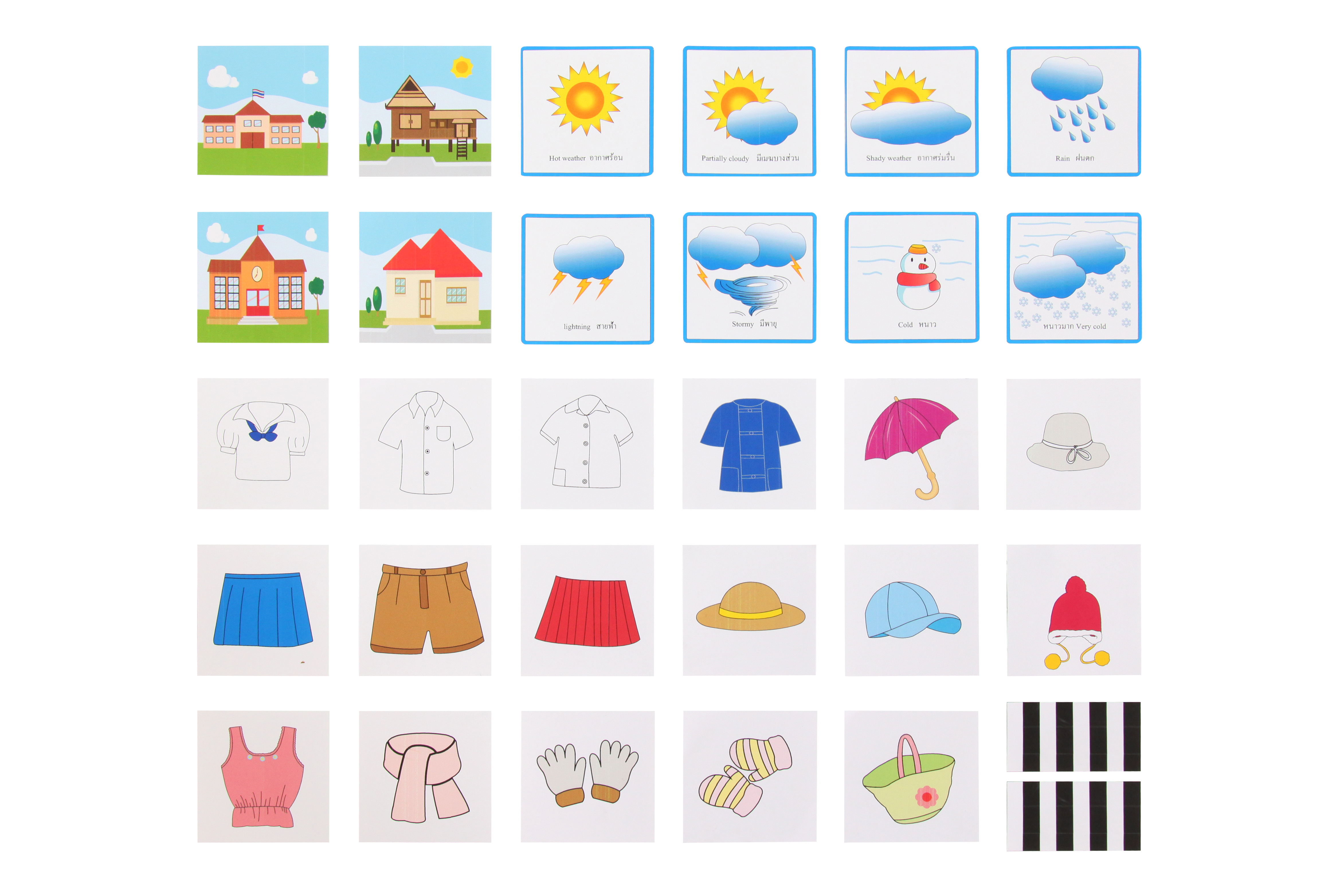 การ์ดรูปภาพขนาดเล็กต่าง ๆ เพื่อเรียนรู้การแต่งกายให้สอดคล้องกับสภาพภูมิอากาศ การ์ดแสดงคำสั่งต่าง ๆ